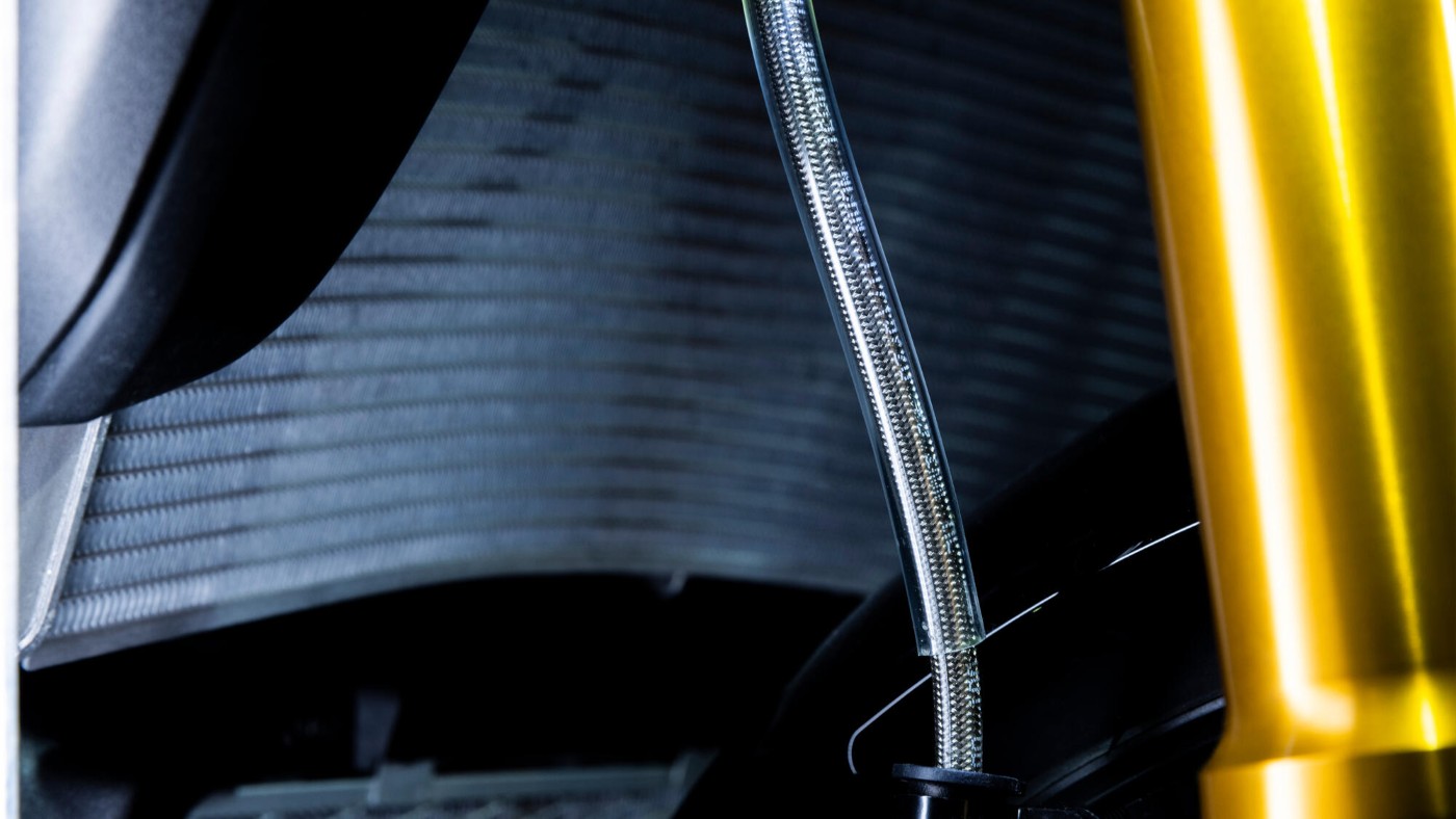 Hochleistungsmotorräder erfordern ebenso leistungsstarke Bremsen. Daher sind die radial montierten Frontbremssättel sowie der hintere Bremssattel mit Stahlflex-Bremsleitungen verbunden, die auch bei extrem hohem Druck eine konstante Bremswirkung und ein gleichbleibendes Bremsgefühl gewährleisten.