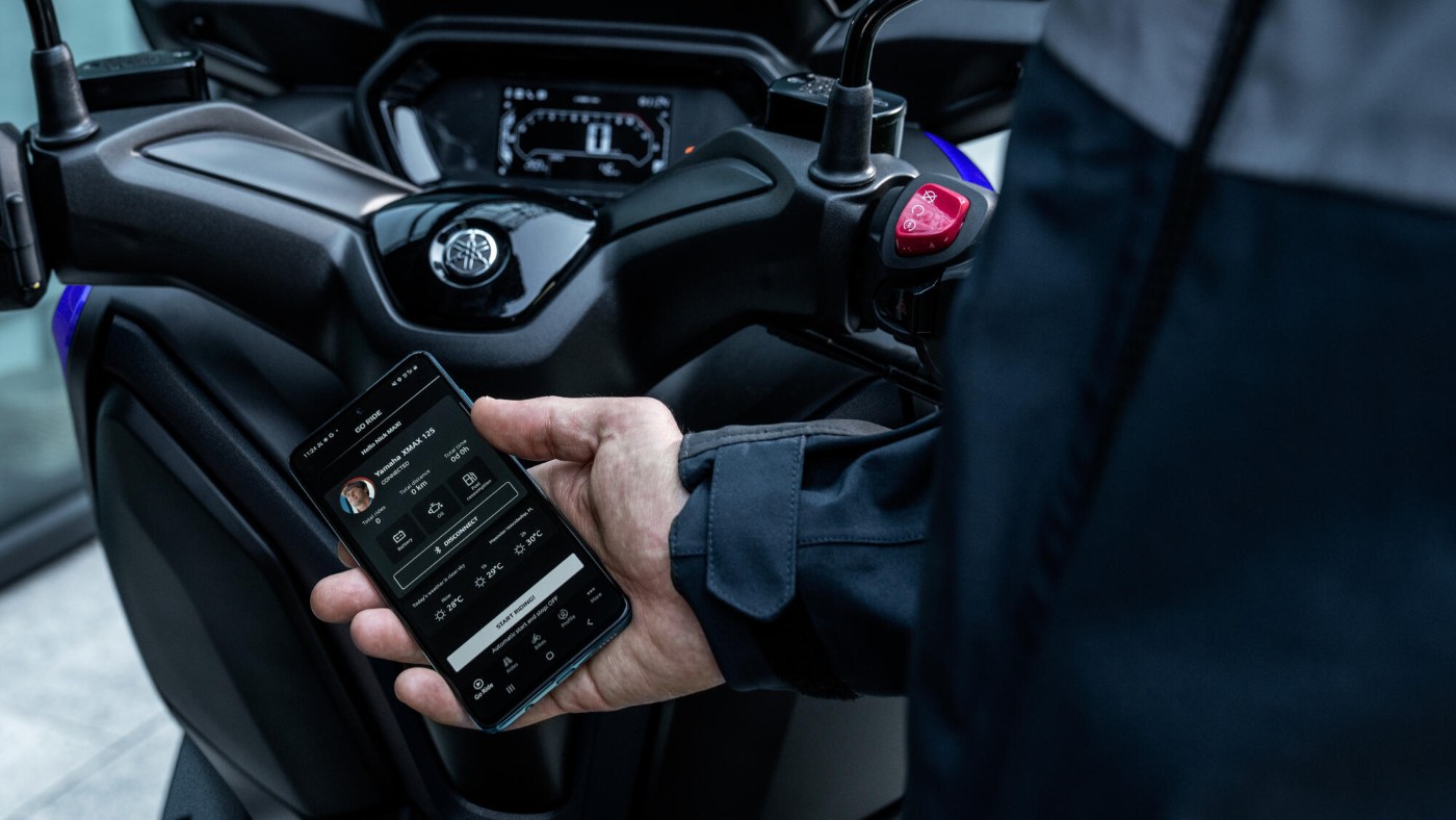 Mit dem Yamaha XMAX 125 bleiben Sie jederzeit einfach und bequem in Verbindung. Laden Sie dazu die kostenlose MyRide-App herunter und koppeln Sie Ihr Smartphone mit dem 4,3-Zoll-LCD-Display, um Benachrichtigungen über Anrufe, E-Mails und Nachrichten direkt zu empfangen. Zusätzlich können Sie auf Motor- und Fahrdaten zugreifen, darunter durchschnittlicher Kraftstoffverbrauch, Reisedetails, Geschwindigkeit, Fahrzeit, Schräglagenwinkel und viele weitere Informationen.